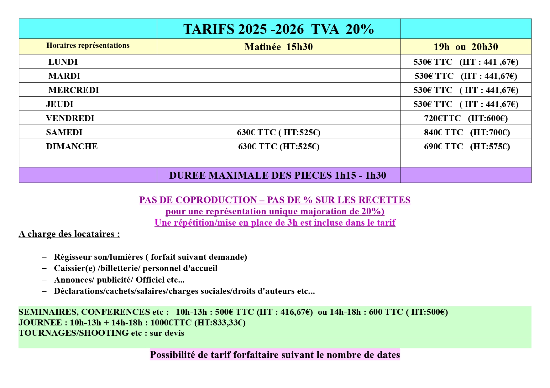 selon les tranches horaires laissées libres par les productions du théâtre pour la saison 2025 - 2026.